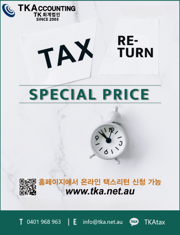 스페샬 Tax Return TKAccounting 0 4770 2025.07.08 18:20 안녕하세요 TK회계법인입니다 온라인으로 tax return해드립니다 아래의 링크로 온라인 신청하시면 됩니다. www.tka.net.au INDIVIDUAL TAX RETURN