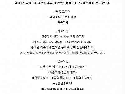 Keysborough VIC 3173 5일 또는 12일 단기 알바 하실분 구합니다. 45불 캐쉬 하루 10시간식
