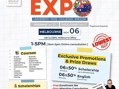 2025 마지막, 유앤아이글로벌 엑스포에 초대합니다! ✔️ 11/6(목) ✔️13:00~17:00 (온라인 09:00~17:00) ✔️ 멜버른 U&I 지사 특별혜택 ✅ 어학원 최대 50% 할인 + 학교 장학금…